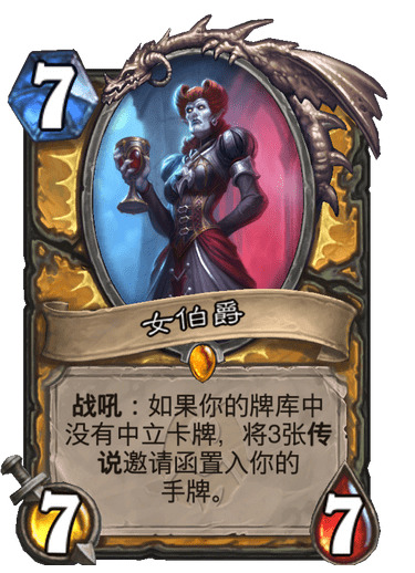 平心而论女伯爵的强度还是比伊瑞尔要高的,因为这张卡存在另一个用法——类似卡扎库杉,等到条件能被触发的时候打出去作为资源牌。不过这就牵扯到另一个问题:骑士目前尚没有稳定抽取中立随从的方法,也是双模式下光铸骑式微的原因之一。就用刚刚举例子的卡扎库杉来说,宝藏牌的总体质量是比发现传说要高的,但是触发条件对于圣骑来讲难度差不多,孰优孰劣相当了然。