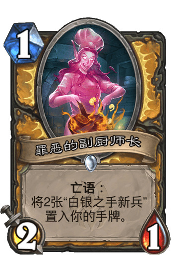 圣骑玩家心心念念的1费曲线。还是比旱谷狱卒要好很多的,至少阅兵类骑士都应该携带。对任务线骑是非常好的补强,能提供至多三个任务进度以及白银之手新兵。不过话说回来,狂野任务线骑4费做完任务5费打下去6费让人清场7费挨打8费寄,标准模式也是宴请八方(迫真),所以就算真的是说得过去的卡,工作环境也限制了它的发挥。此外,狂野模式的薄宇宙骑可以考虑携带一张润滑曲线打满费用。