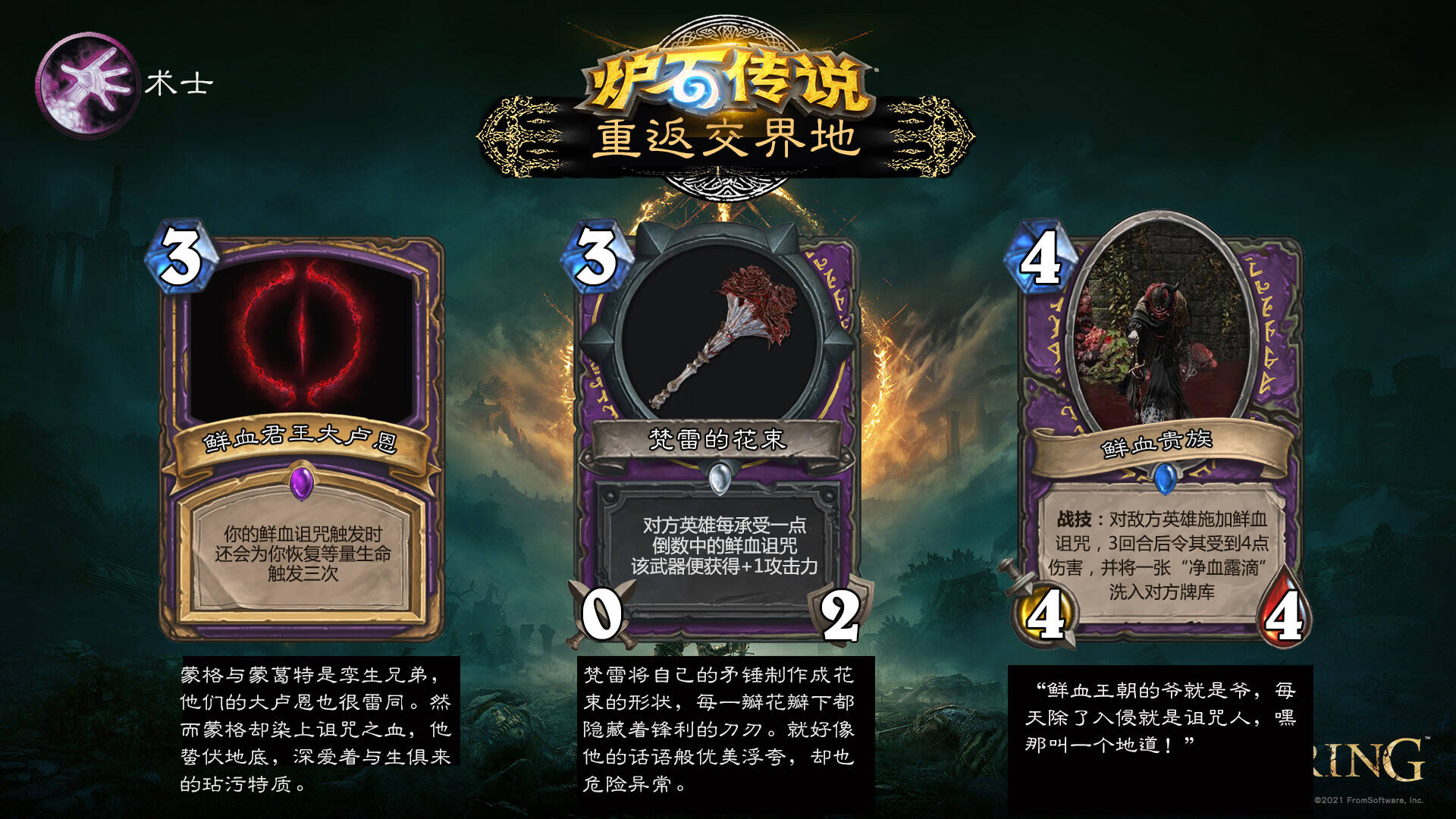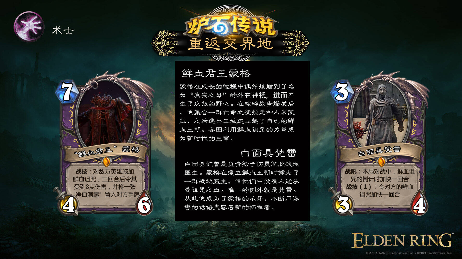 在艾尔登法环中,如果说有哪个半神势力是绝对的反派担当提款机,那么鲜血君王蒙格绝对会成为第一个答案。这位充满野心的反派在碎片战争中他背叛黄金一族,建立了恐怖的鲜血王朝,悍然做起了成王的美梦,最终被褪色者施以正义制裁。本次扩展包的术士篇,我们根据蒙格的能力设计了全职业机制“鲜血诅咒”,在改进现有诅咒机制的同时进一步展现蒙格这位鲜血君王的残忍恐怖。