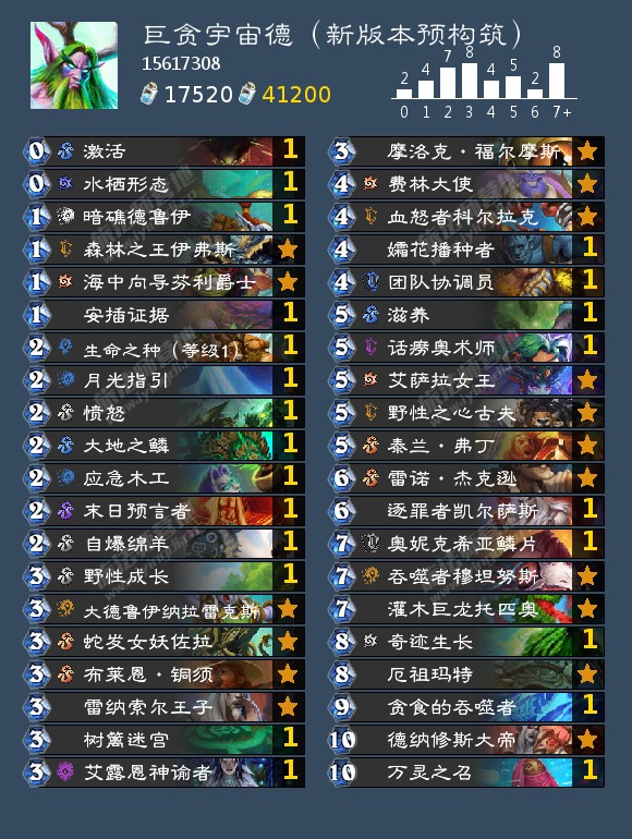 宇宙巨贪德那套蓝本为之前的“究极巨贪宇宙德!”,作者15617308根据新版本特色进行了大刀阔斧的改动——最主要的一点是放弃了龙体系,转而以维纳修斯大帝为主要终结手段。并用其他各种优质单卡和资源作补充,融入了新的亡语体系。至于说法夜朝臣瑟赛莉,作者暂时没有考虑带,因为这套卡组低费生物的数量还是比较多,检索效果可能不太理想。整体卡组后续仍有调整的可能。