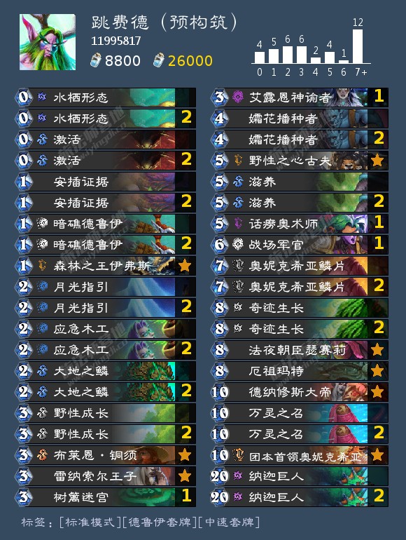 后一套瑟赛莉德打的是一套亡语体系,同样是用的上版本跳费德的底子,作者在这版本补充了一张跳费和其他优质牌,让这个卡组也能40构筑。 前期跳费,巨人中期展开,万灵和奇迹生长过牌,后期铜须德纳修斯斩杀。地标树篱迷宫可以配合配合厄祖玛特清场或者法夜朝臣瑟赛莉给抽到核心生物并减费。整体卡组后续同样也有调整的可能。