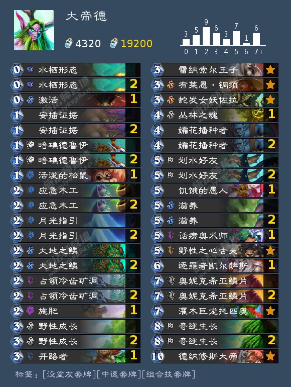 最后一套德,作者综合了自己的理解和昨晚看夏布去玩的大帝德,主要依靠铜须加大帝打出高额伤害获得胜利。前期占领冷齿矿洞定向抽大帝,靠划水好友等卡刷伤害,配合铜须能四十多otk。费用够用的话铜须凯子大帝再用佐拉回手大帝,再下一个怪又能上一次大帝,能完成九十点的斩杀。