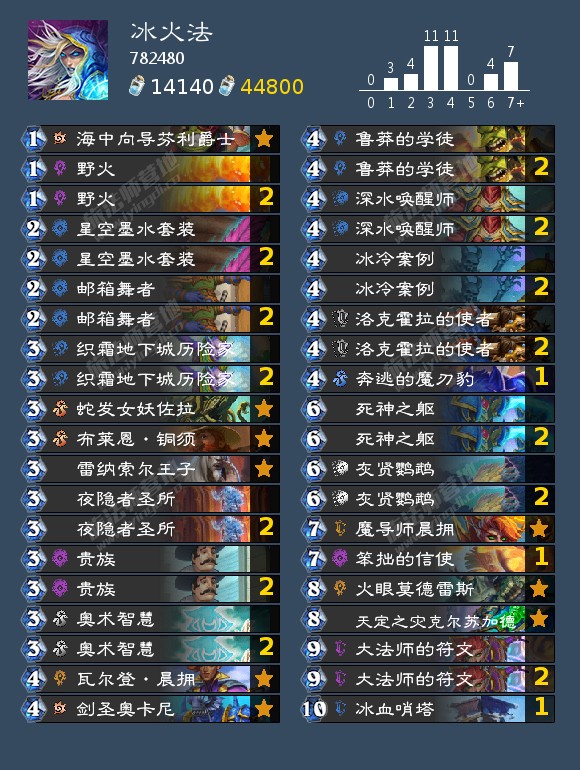 来自782480的冰火法。这套卡组的主要思路是通过星空墨水套装给大法师的符文等卡减费,鹦鹉重复释放大量召唤骷髅的法术使得天定之灾克尔苏加德刷出大量伤害、火冲体系完成控场和最后伤害的补足 以获得胜利。另外可以用笨拙的信使丢出冰血哨塔,相当于过3张牌,到最后打不过就丢大法师的符文尝试翻盘。