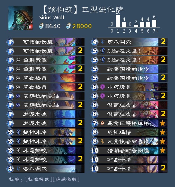 这两套卡组让我看到了进化萨的新思路,它们分别打开了进化萨的两扇大门:混搭体系和特殊构筑。在试玩预构筑时,我并没往控制去想(要玩就玩新体系),并且觉得【始源之潮】和雪落有些冲突,但想想另外两个进化牌都是单体进化,和雪落的兼容性好像没那么差,【始源之潮】就当一张高一费的【衰变】也未尝不可,同时鱼控萨的底子还在,加入进化体系后的【粗暴的看管者】可以提供一定的防守,还可以配合鹦鹉。天狼的发散思维我之前一直期期不落,这次的巨型进化萨我觉得很新颖。看到进化萨随从铺不起来的劣势,转而直接放弃前期随从,改为法术召唤和亡语巨型的思路,既契合这版本主推的单体进化(扬长),又免去了前期缺少优质进化载体的弊端(避短),【假面狂欢者】配合进化的思路更是让我啧啧称奇。三张巨型随从作为完美的频率,被【假面狂欢者】拉出来后,2/2的本体和大量附属物无论单体还是群体进化都能适应,【石裔干将】也是优秀的载体,可以在解场后进化来巩固场面。这样看来,进化萨的可行性还是不小的,至少不像我之前执着于传统铺场流进化萨一样坐牢。进化萨的发动机质量很高,但缺少前期的进化载体,只能通过混搭体系或特殊构筑的方式实现其可玩性。
