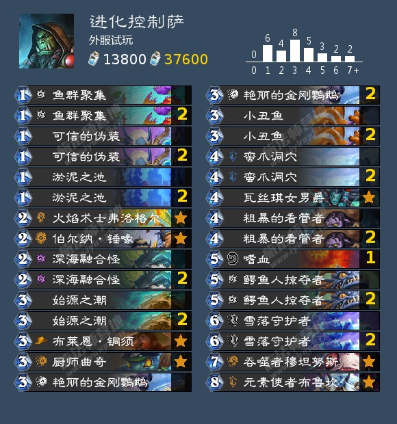 以上五张牌为新版本进化体系的新卡,综合整个体系,我的结论是发动机有余,收益端不足。新版本给了萨满【可信的伪装】和【淤泥之池】两张优质的进化牌,却在进化的收益随从上十分保守。中立的【迷宫向导】算是前期不错的随从,一费【淤泥之池】二费【迷宫向导】的combo也还不错,但现在的标准进化萨缺少爆发性的场面,唯一可能是老哥们一直在说的注能后【可信的伪装】配合【小巧玩具】的一波爆发,但这个combo费用过高,且需要前置条件。至于我在试玩前设想的鱼人轴的铺场过牌,在实战中狠狠的打了我的脸。整套卡组在缺少鱼人这个关键发动机时十分僵硬,在鱼人来的时候进化体系的表现又明显不如【鱼勇可贾】和【嗜血】;同时群体进化的【可信的伪装】需要送随从,而进化萨鼓励优势交换滚雪球。新卡和传统思路的冲突使得传统的铺场进化萨十分尴尬。在我咕咕的这段时间里,我看到了进化萨的两种新思路:以鱼控为主混搭进化体系的进化控制萨(来自外服);以及彻底放弃前期随从追求进化大哥的巨型进化萨(来自天狼)。