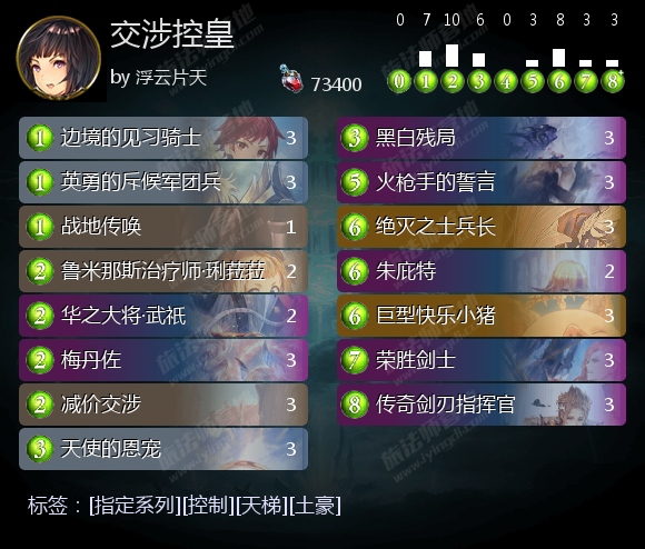 为了使这些高费大哥尽早登场,这套牌投入了减价交涉。它有机会抽到传剑或荣胜,并为其减费。配合梅丹佐,这套牌甚至有机会在后手第6回合便拍出传剑,很大程度上解决传剑在登场当回合亏节奏的问题。