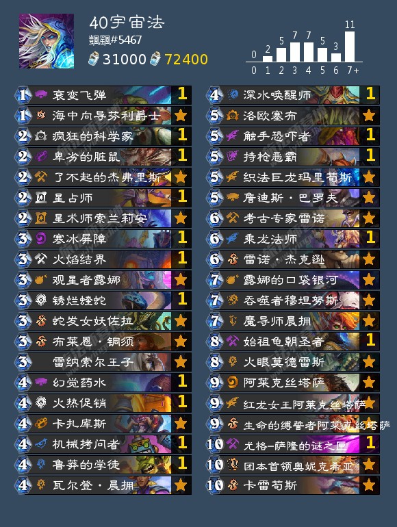 总结:宇宙法目前生存环境很艰难,操作上几乎没有容错空间,同时面对对手的天胡或者神抽也几乎无计可施(包括但不限于德鲁伊四回合之内超凡切刀,萨满5费一地鱼,其中还吃了我们一个大怪,开门法4费拿到门,号角骑空手牌神恩术)。
