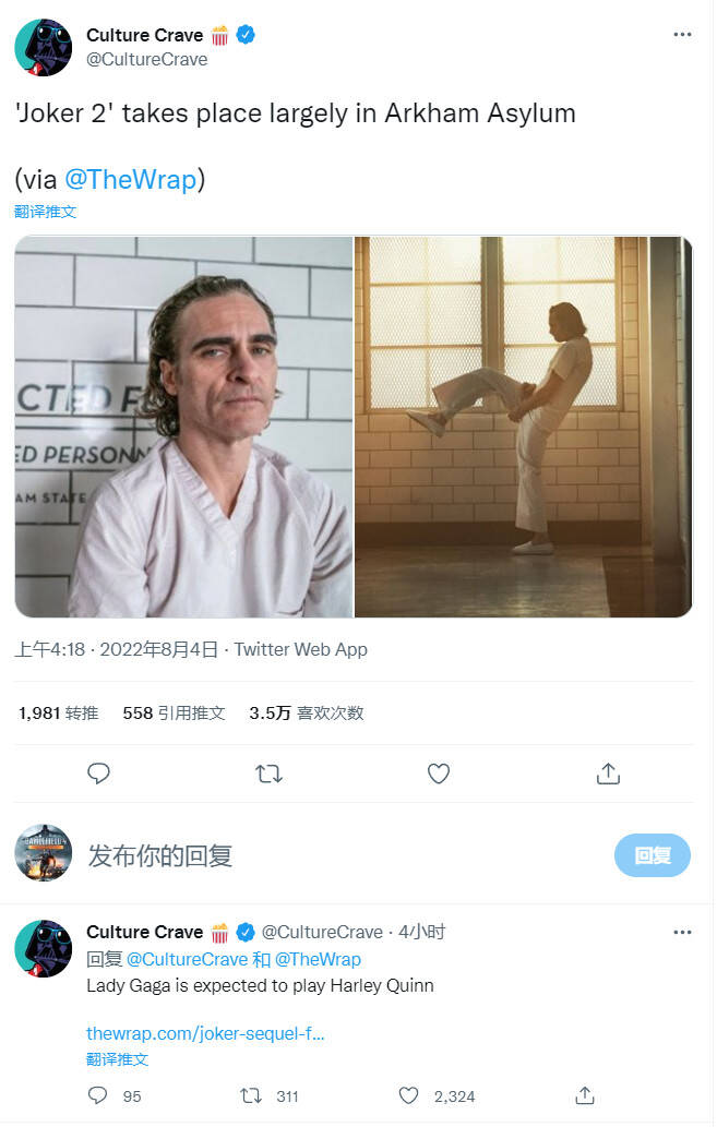 外媒The Warp爆料《小丑2》主要发生在阿卡姆疯人院,Lady Gaga扮演小丑女
