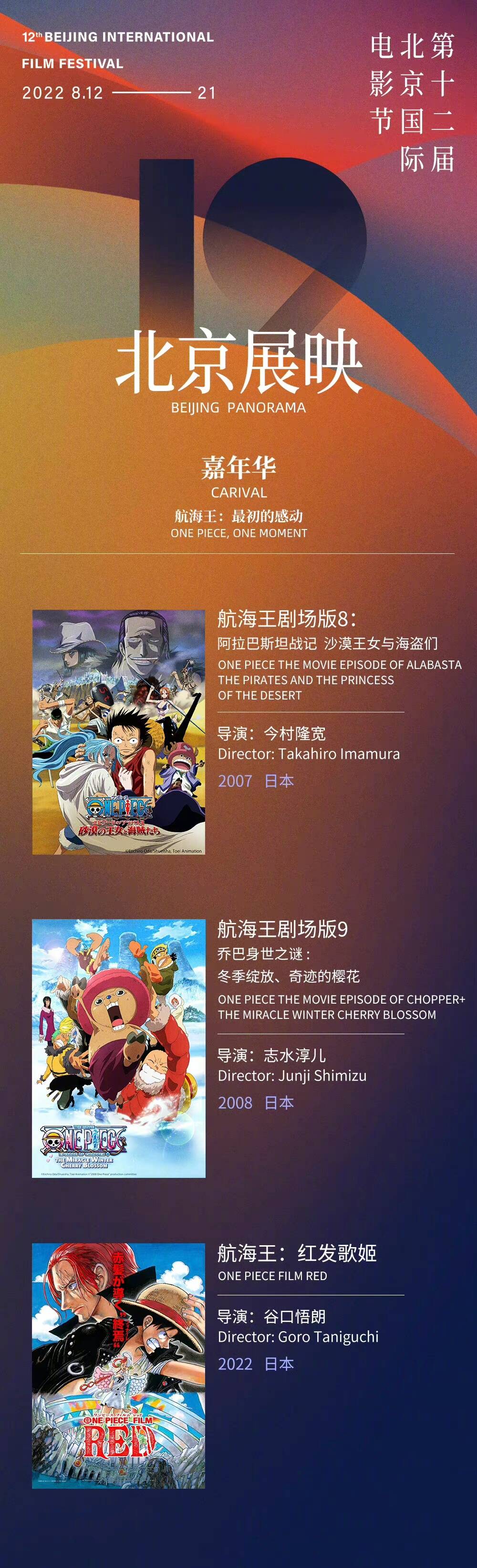 今天,第十二届北京国际电影节“北京展映”【航海王:最初的感动】单元片单公布,将对《航海王剧场版8:阿拉巴斯坦战记 沙漠王女与海盗们》《航海王剧场版9乔巴身世之谜:冬季绽放、奇迹的樱花》以及2022年最新剧场版《航海王:红发歌姬》三部作品进行展映!