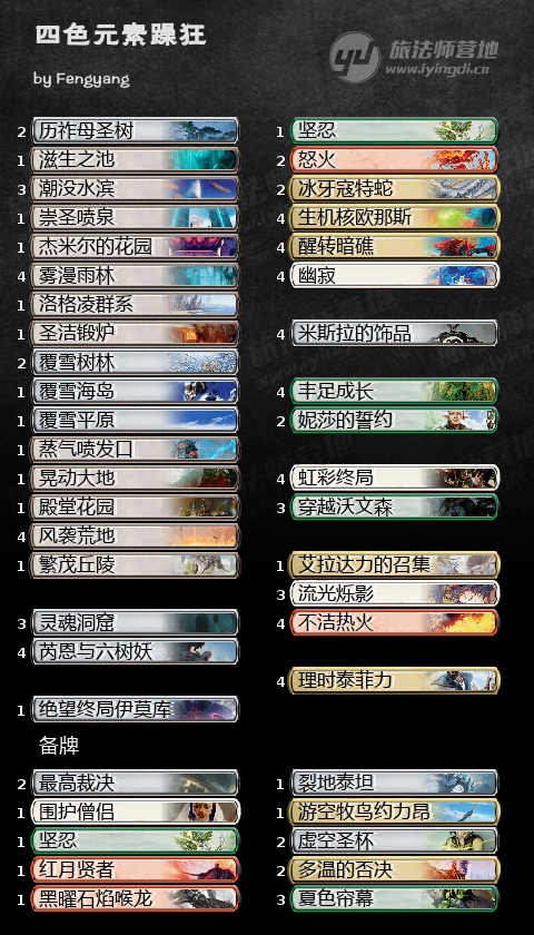 此前的摩登比赛我一直使用60张元素套牌,在对阵主流的红蓝龙侯、大锤都有不错抗性,但对阵4c颇感疲软无力。上周无意间在mo challenge上看到一套4c元素躁狂,相见恨晚之余,迫不及待地点齐了兵将,却在某店家冠军赛中被无畏创新杀了个溃不成军。痛定思痛之下,对备牌进行了些许的修改,抱着再试一试的心态参加了这次比赛。
