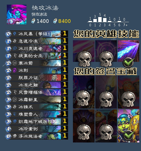 对比传统的以控制体系为主冰法,这套快攻冰法携带炎桶进行铺场,卡组很多单卡都为快攻体系服务,造价便宜,但随之而来的缺点是,一宝必须赌冰霜凝结,不然强度会大下滑,但一旦赌出了冰霜凝结,保本高胜不成问题