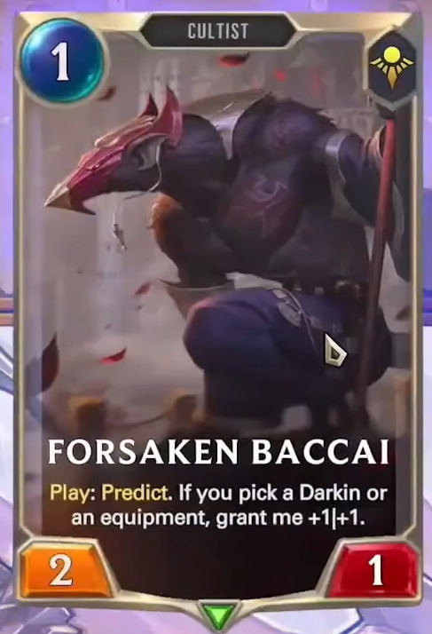 打出:预测。若己方选择暗裔或装备,给此牌+1|+1。