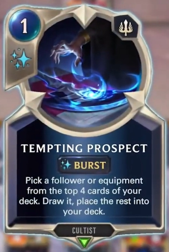 从己方牌组顶的四张牌中选择一个随从或装备,抽取该牌,将其余置入己方牌组。