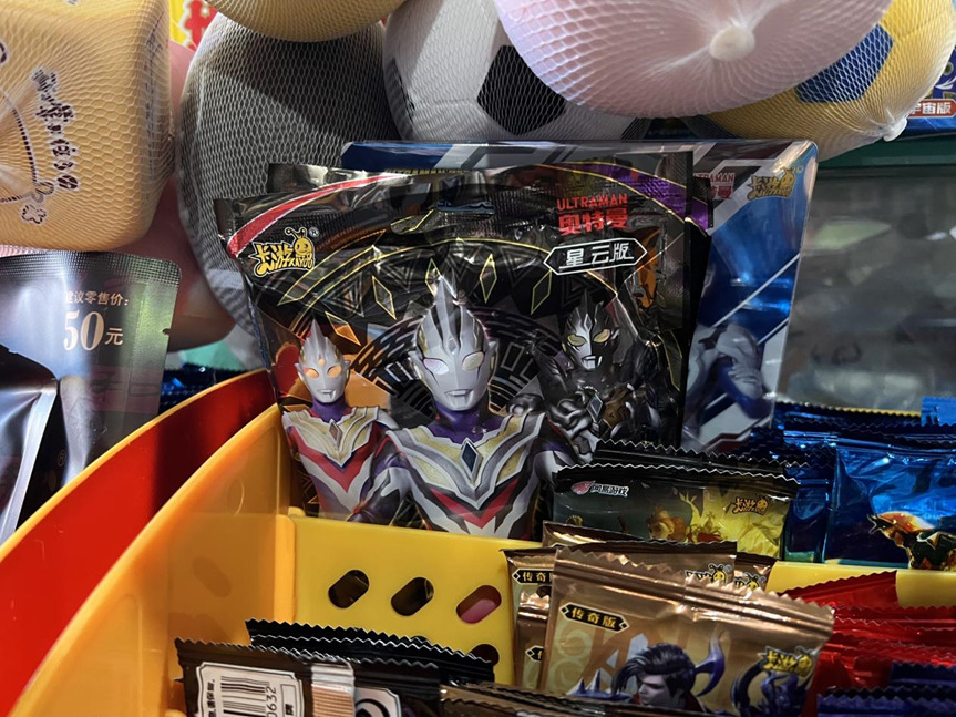 《中国企业家》走访了北京多家学校门口的文具店,发现在收银台,大多都会摆着一个奥特曼卡牌的盒子,里面装着1元包、2元包、5元包、10元包的散包。上述晨光文具店老板告诉《中国企业家》,大多是男生们来买奥特曼卡牌,他们喜欢拆着玩。
