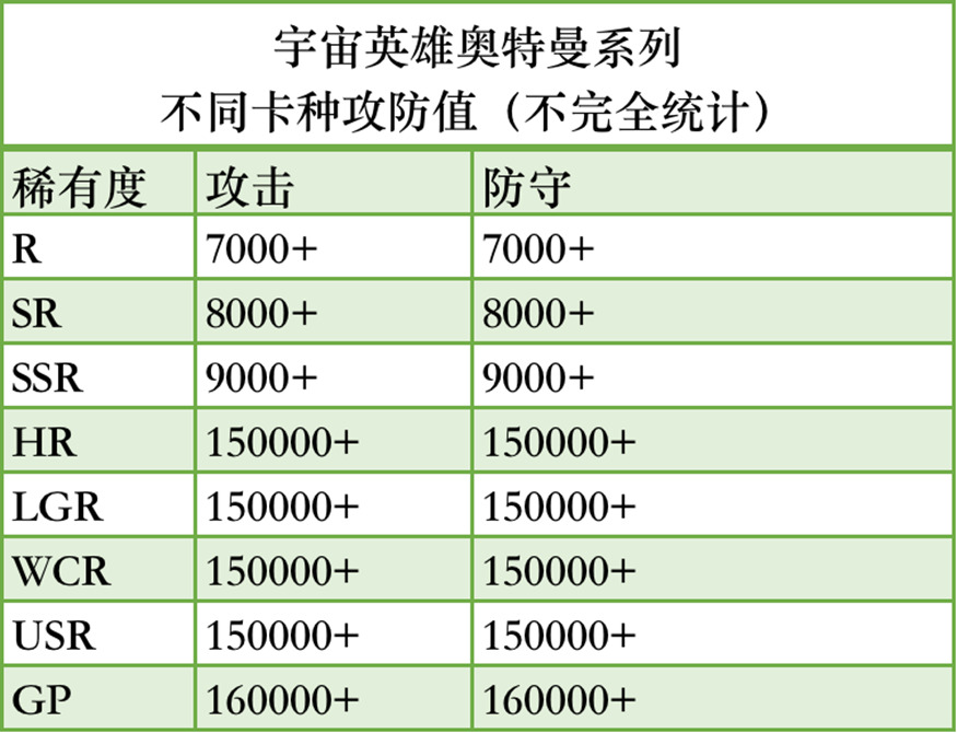 《中国企业家》梳理发现,奥特曼卡牌分为多个等级。单是宇宙英雄奥特曼系列,等级就多达23种,分别为SP、XR、GP、ZR、LGR、OR、CP、USR、UR、HR、SLR、LR、TNR、TZR、TGR、TSR、TR、WCR、GMR、SSR、PR、SR、R。