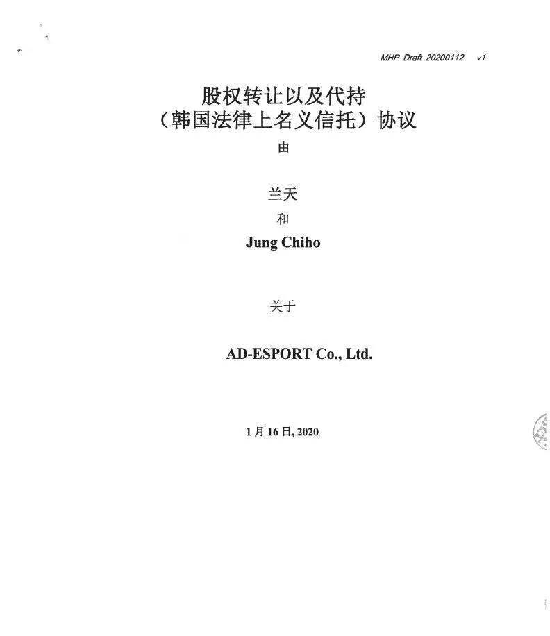此时恰逢LCK进入联盟化的阶段,郑智浩以“担心联盟化因为DWG的中国老板身份会有一些障碍”等多个理由,劝我将股份由他代持,并承诺事后再将我登录进DWG的股东名单。此后的一段时间,我将购买金额全部付清,并将股权转移代持到郑智浩身上,并且由他在韩国处理运营DWG的相关事宜。