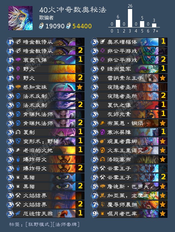 有人说我抄袭,听到这里我笑了,你怕是学过炉石版权法吧,毕竟给大家带来启发和快乐才是我的本意。奥秘法作为昔日的王者,自从被新卡组碾压后一蹶不振。这版本设计师终于想起了法师还有奥秘这一设定,于是奥秘法迎来了久违的加强。作为昔日狂野高分段知名奥秘法人柱力,骗子这版本试图去拯救一下这位老战友。先说说构筑理解,这套依旧沿用了奥秘法的经典模板,世面上有很多40宇宙法,骗子依然是奇数奥秘的坚持者,而且奥秘法的卡位也没有少到要带30张。野火简单粗暴,爆发十足,完爆猎人技能,取代了从前的火冲。暗金教侍从,是优质的一费随从,也能起到白嫖费用,润滑曲线的作用,出于卡组原因满编两张。龙鹰之神跟魔导师晨拥一样,给了奥秘法强大的韧性,只怕一手精控和催心者,准时77的奥秘法更是压迫感十足。