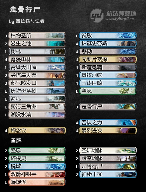 备牌我们需要一些更多的坚忍和锐敏,神器结界解,生物解,反击咒语,坟场针对,和一些保护自己的手段。最后一个卡位留给了第四张走骨,在对手互动较多的对局换入增加稳定性。
