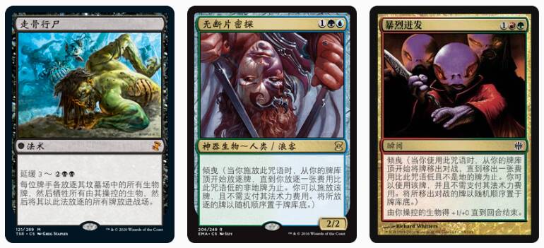这张牌没有费用,所以无法直接施放,其延缓异能也约等于没有,因此我们最合理的解决办法是用倾曳牌将它从牌库里翻出来,直接施放,因此套牌的颜色本质是两种强力三费倾曳牌:暴烈迸发和无断片密探的铁木尔色。也因为要稳定翻出走骨行尸,套牌里不能使用任何0费-2费的单卡。套牌的玩法是用循环和呼魂异能将生物填进坟场,三费直接倾曳走骨,完场清场+返场,靠可怕的场面获得胜利。