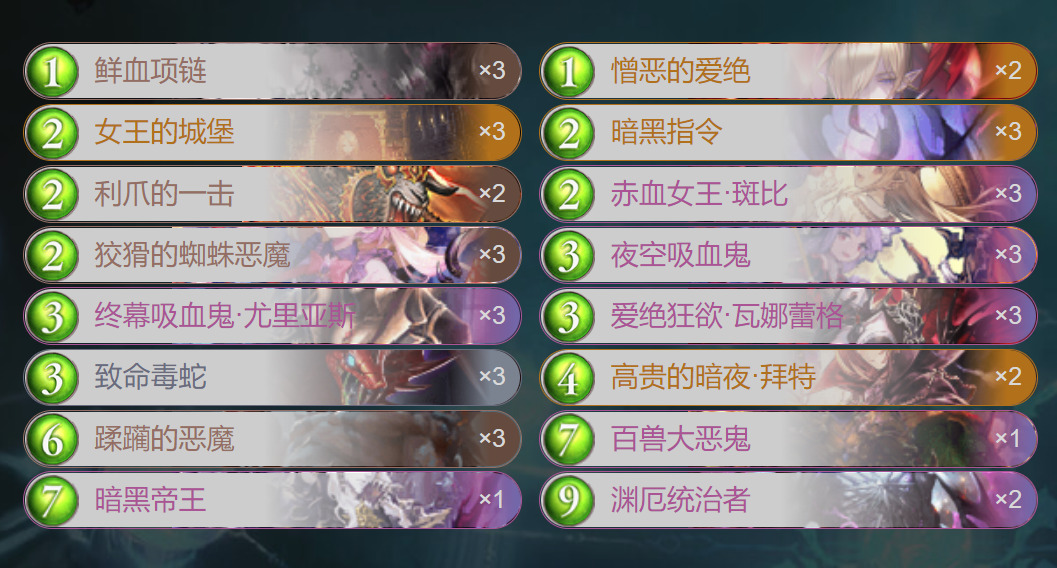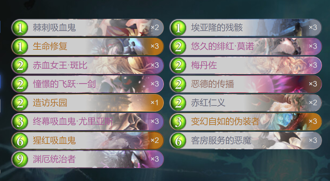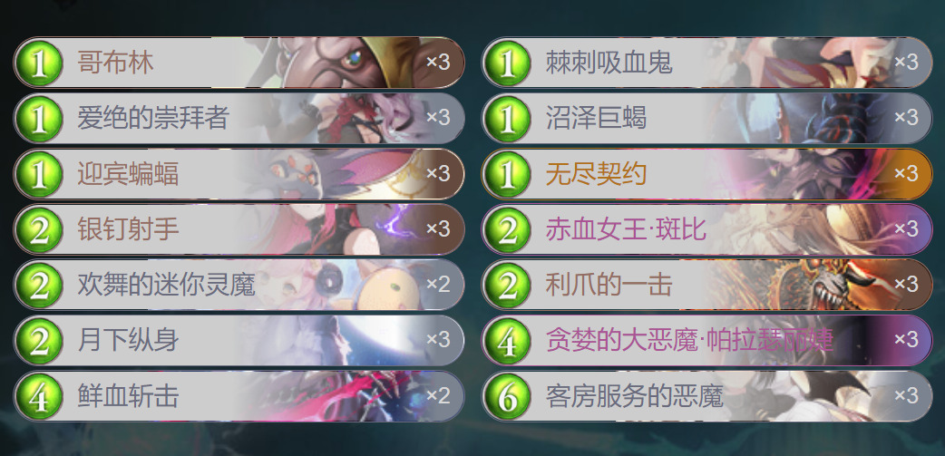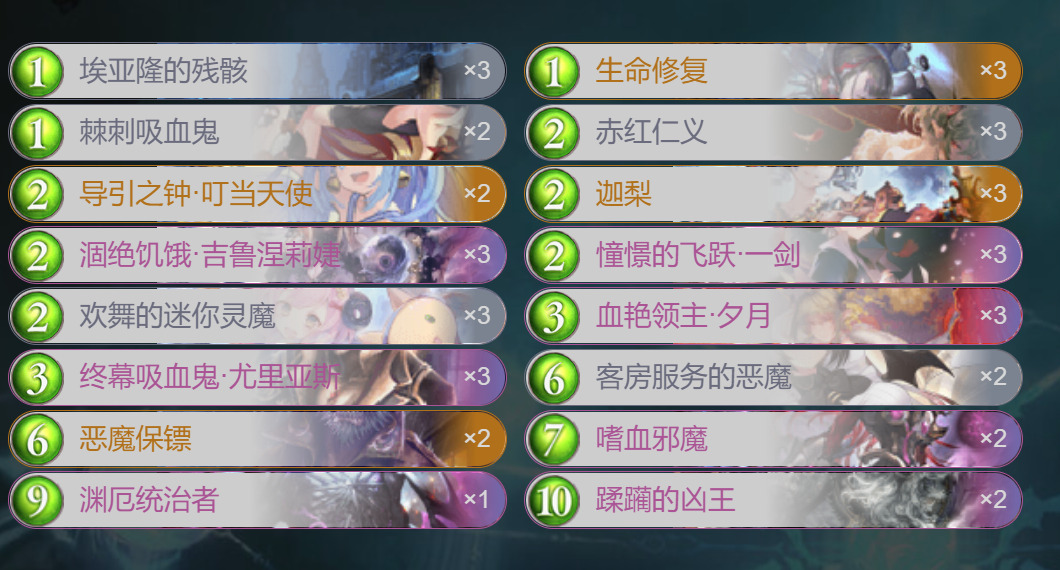 在当前版本,为了直接撕碎进化回合对方的随从交换能力,永火鬼投入了“欢舞的迷你灵魔”,以达到废掉对方“涸绝饥饿·吉尔涅莉婕”的作用,同时投入了“赤血女王·斑比”,使得对方前期完全空场的情况下己方也能更好地卸完手牌,且斑比还可以参与进化回合之后打伤害的环节之中。