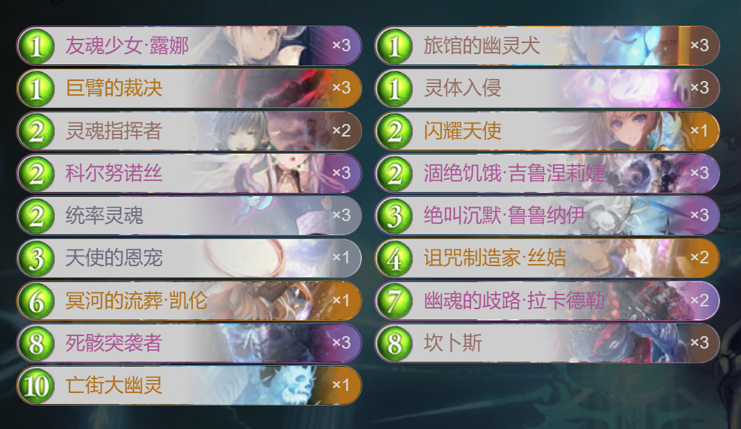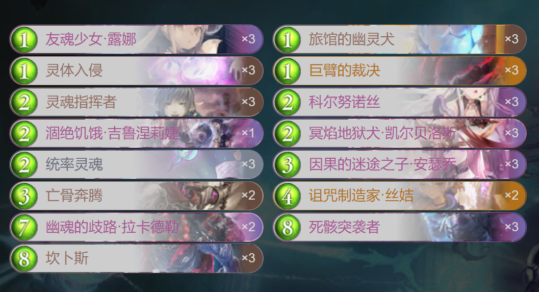 大幽灵死主要是在唤灵20之后用单个“科尔努诺斯”拉出“亡街大幽灵”,极**干扰对手的计划,同时攒足伤害,依靠手牌中的其他伤害牌配合进化后大幽灵的12点打出近满血的伤害。