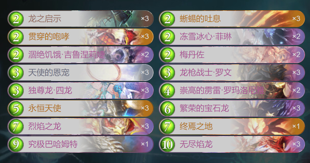 宝石龙的制胜手段明确,前期跳费解场回血,当一套控制卡组玩,贴上“繁荣的宝石龙”主战者效果后,便能在十费用“无尽焰龙”加上“贯穿的咆哮”打5+5+10的20血OTK效果,或者跳出巴哈以控制手段取胜。