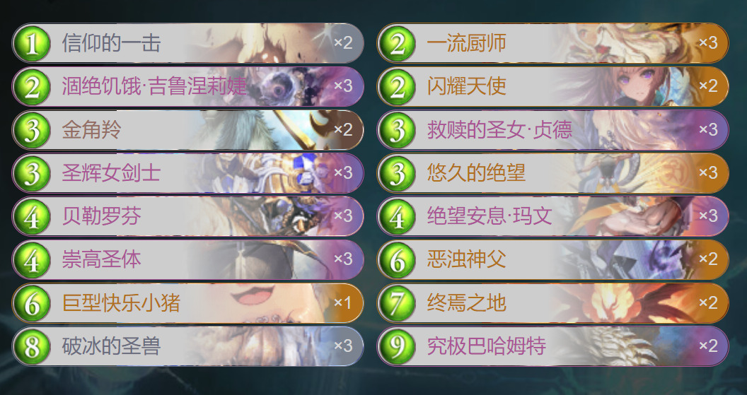 守护教是一套典型的中速卡组,前中期拉起大量高血量的守护场面并完成进化和破坏守护随从数的任务,依赖拉扯到八费后靠完成任务的爆能“圣辉女剑士”和“光璨圣骑士·维尔伯特”提供的主战者效果取胜,且在当前版本中会**一张巴哈,借助圣女的回费效果让巴哈与圣女一同下场,使对手失去胜利的希望。