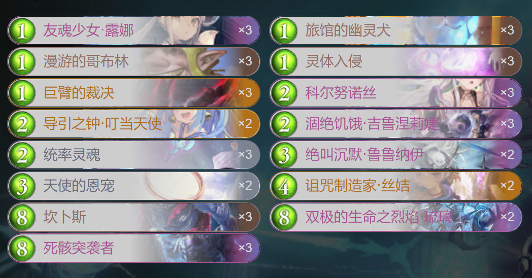 双子死的优点在于可以拥有大量卡位投入强大的中立卡,如“漫游的哥布林”、“涸绝饥饿·吉鲁涅莉婕”等可以保证自身血量的卡,同时三哥“绝叫沉默·鲁鲁纳伊”也拥有一卡解决铺场卡组中期压力的能力,使得双子死可以保证自己顺利活到斩杀回合。