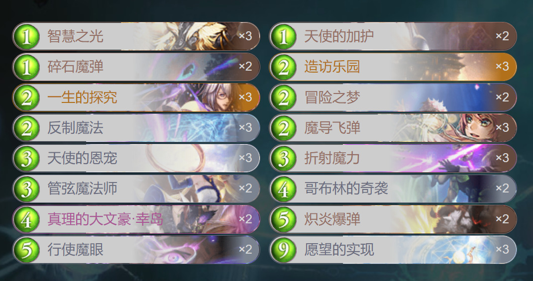 抽牌法的制胜手段十分明确,依靠“真理的大文豪·幸岛”提供的主战者效果给“管弦魔法师”加身材,依赖后者的疾驰效果结束游戏,或者拖到九费,依靠文豪自身的爆能效果取胜。