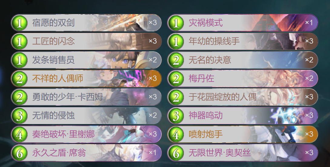 人偶仇的节奏在正常展开情况下对手难以阻挡,并且高效的前期铺场节奏面对各路快攻卡组不落下风,同时“奏绝破坏·里榭娜”和神器都具有灵活性,可以灵活面对各路卡组,六费准时的三融合奥契丝更是大杀器,77+68的场面需要大量资源才能解完,同时爆能的“喷射炮手”也是高效的直伤手段。