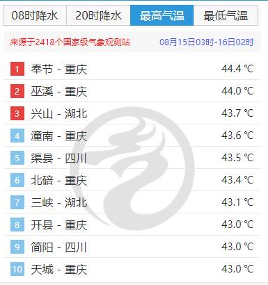 根据中央气象台24小时高温纪录显示,前十排行榜已经被重庆霸占了六席,最高温度已经冲上44.4℃,最低的第十位也已经达到43℃。