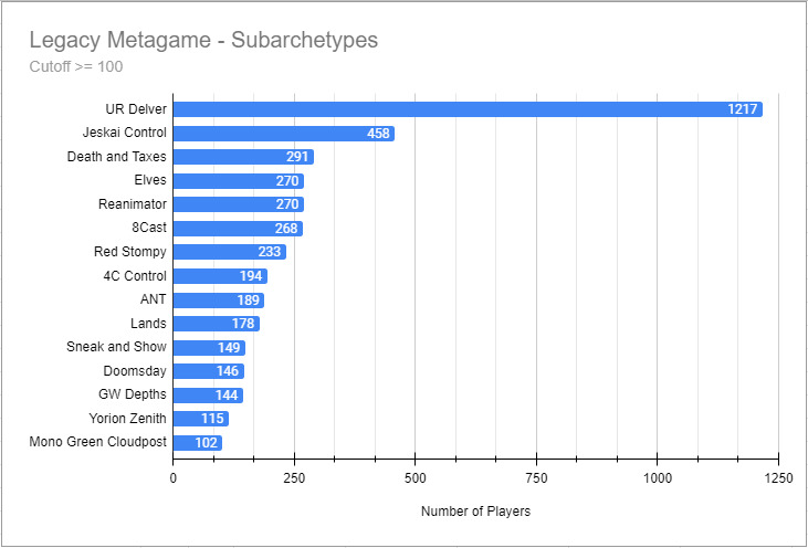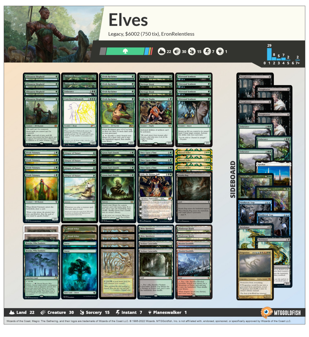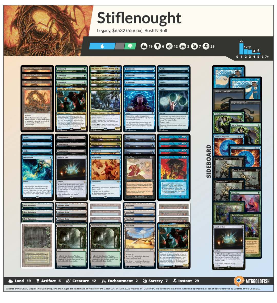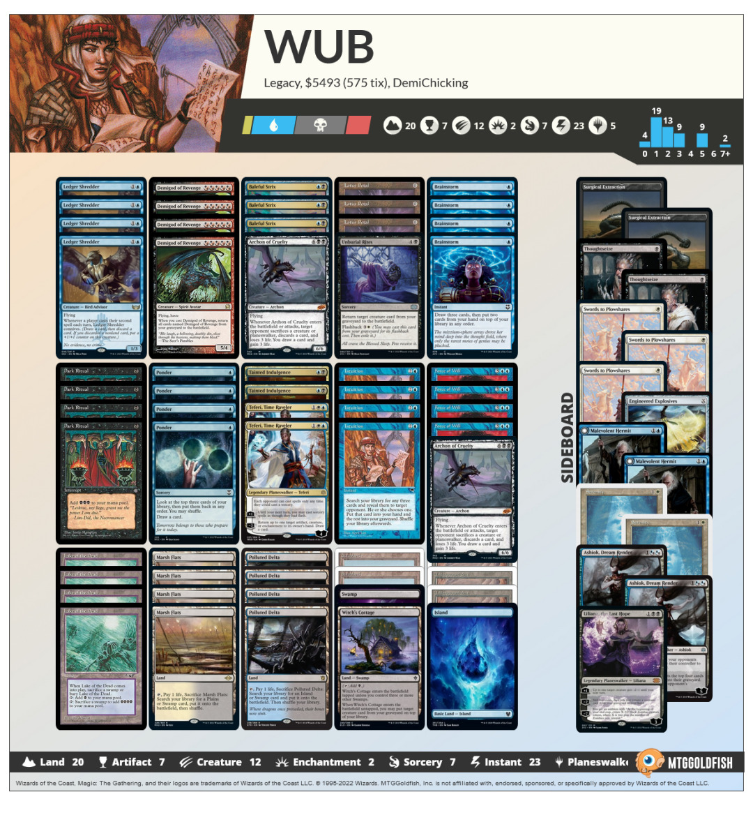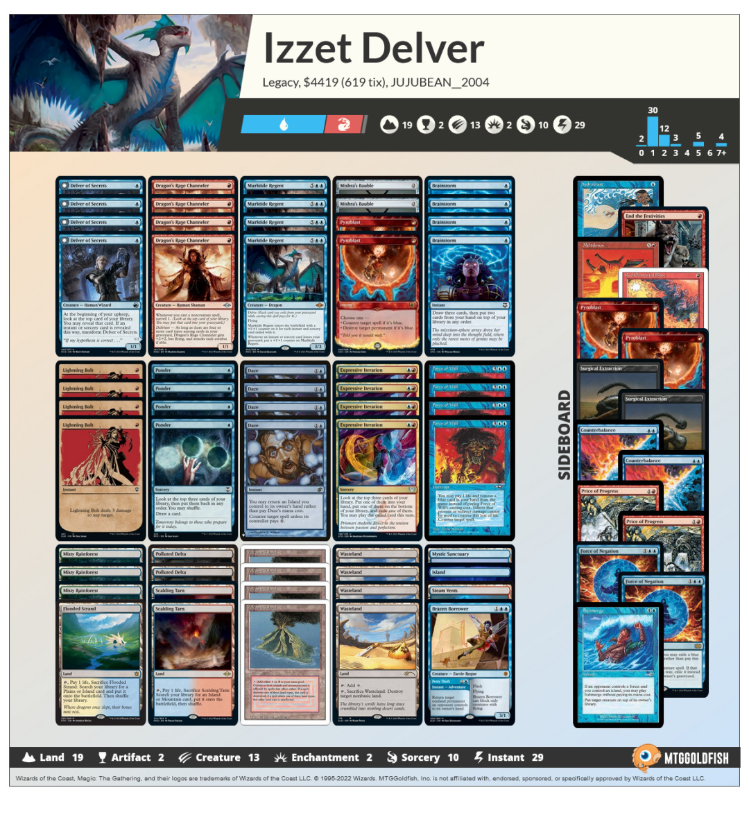 上周还有一场 Legacy Showcase Qualifier event,因为符合参赛资格的人很少,所以只有 29 人参赛,牌表对大众来说没有参考价值,因为高端的食材往往参赛者会以极端竞技的思路考量 meta 和构筑套牌。同样因为没有官方牌表,所以我们只能通过 Legacy Data Collection Project 一窥门径。