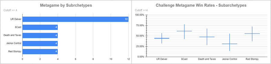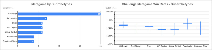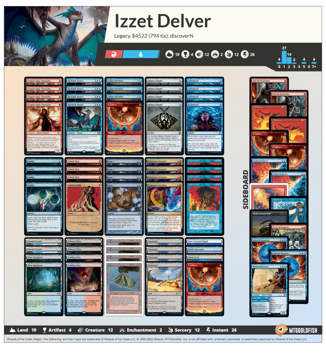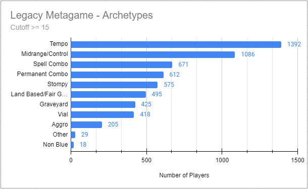 正如我们在七月中提到的,Tempo 套牌目前被 红蓝掘密师 所定义。(这次数据里 1392 套 Tempo 中有 1217 是 红蓝掘密师)。值得注意的是,出于一致性的原因,我们目前并没有将 “带掘密师” 和 “不带掘密师” 的组法(带 碎帐艾文 和 龙怒通念师)分开。这样做的原因是“掘密师”牌组的核心并不一定需要有“掘密师”,而“掘密师”本身则是基于 URx 色组的 Tempo 套牌的名称。在未来,我们可能会考虑重新命名为 红蓝节奏,但随着时间的推移,经典的名称总是更受人们的欢迎。还有另一个原因,从比赛回放(replay)中识别套牌中是否包含 掘密师 比识别其他核心牌(如 Brainstorm/Force of Will/Daze/Wasteland)要困难得多,而将这些套牌区分开来需要花费更多的精力。由于该项目的人手有限,所以目前还是保留原来的套牌命名规则。