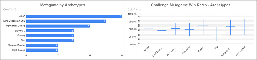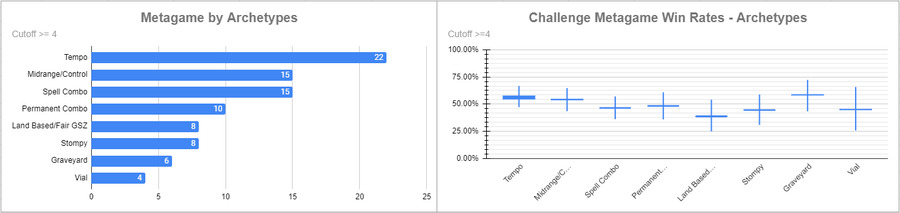 正如我们所看到的,当前薪传里 Tempo 和 Midrange/Control 占据了 meta 的大头,其中 Tempo 占比 23.5%,Midrange/Control 的份额则是 18.3% 。但是环境中也有相当数量的组合技,咒语组合技和永久物组合技加总后数量多于 Midrange/Control ,仅次于 Tempo 。