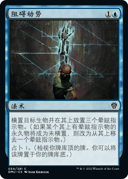 如果上面有晕眩指示物的已横置永久物将成为未横置(即将要重置),则改为它仍为已横置,且你从其上移去一个晕眩指示物。你可以在已横置的永久物上放置晕眩指示物。举例来说,你可以施放阻碍动势,并指定一个已横置的生物为目标。这样你会在其上放置三个晕眩指示物并占卜1。该生物要试图重置三次,才能移去其上这些指示物,等到第四次尝试重置时才能成功。