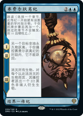 举例来说,如果你的对手有些身形巨大,难以去除的怪兽准备终结游戏,相比之下其他2/2的非瑞人(等等,非瑞人?它们在这里做什么?)看起来就更人畜无害一些,那你就可以施放赛费尔跃离史,并令它进战场时上面带有三个学问指示物。这样章节三的异能会触发。而章节一和章节二的异能都不会。章节三仍然是最后一张,因此一旦该异能结算后,你就要牺牲赛费尔跃离史。虽快速略览,但效果非凡。