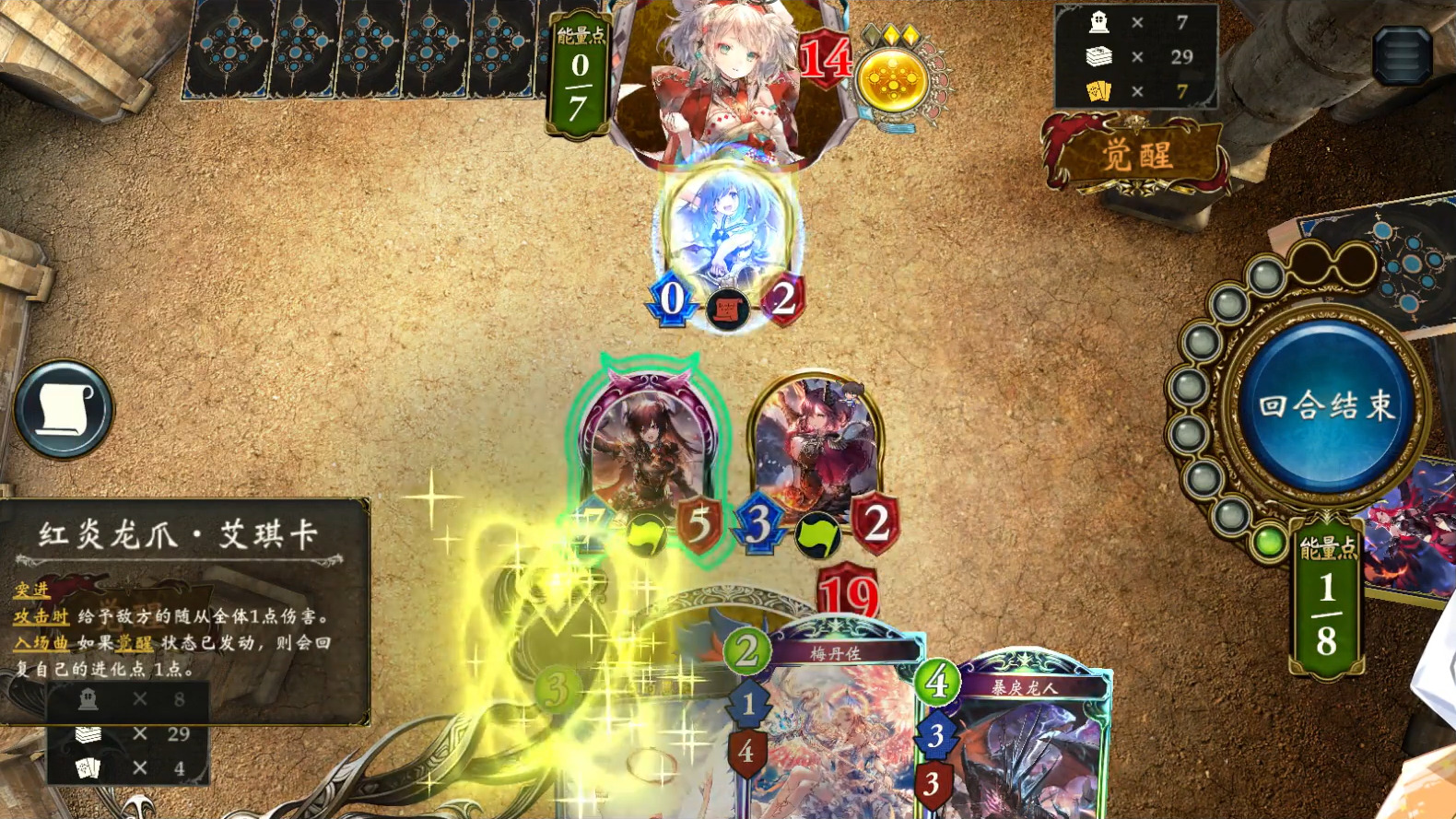 红炎龙爪·艾琪卡能以不消耗进化点的方式高效解场,还可以在觉醒后补充进化点,提升暴戾龙人、烈绝侮蔑·嘉鲁蜜儿、黑翼霸主·法露特等进化特效随从的效率。