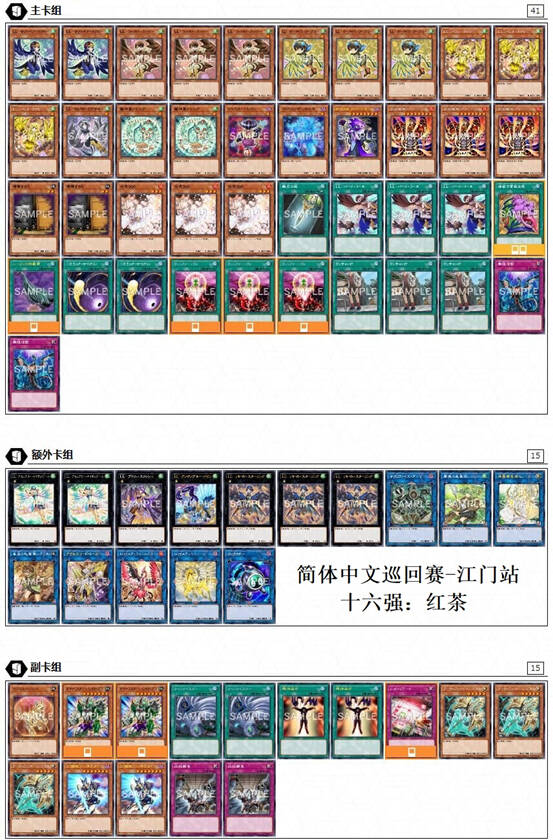 红茶选手在主卡组中投入了『魔术师双魂』、『滑稽艺人』和『雏神鸟西摩格』这些召唤条件简单的一星怪兽,保证了【抒情歌鸲】超量怪兽的素材数量;副卡组中的『魔术猎犬』可以在side局中用来解决『千查万别』、『技能抽取』等卡组比较害怕的贴纸。