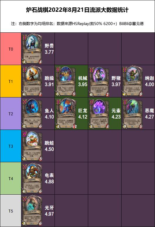 由于多彩龙被削弱导致巨龙从T0降到T2但仍然比纳迦刚出的版本要好;机械由于削弱版的滑油回归仍有小幅提升;而版本卡牌数加强最多的元素只能说中规中矩吧。