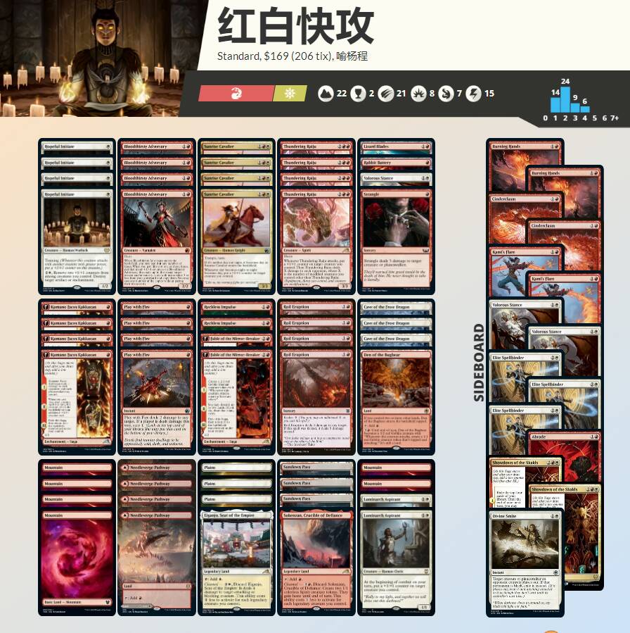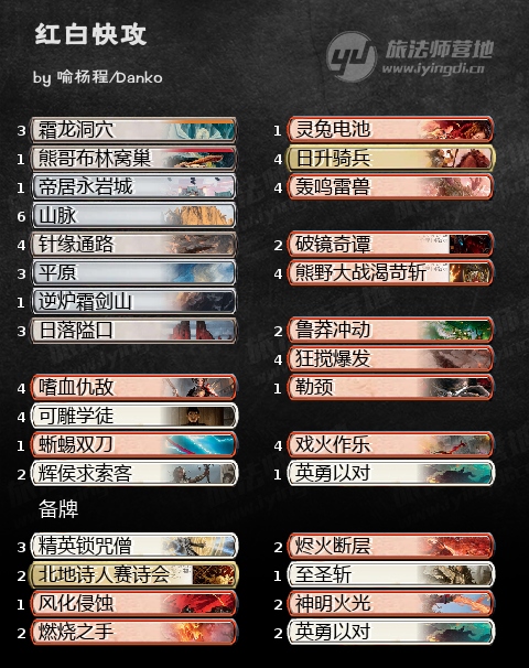 一套不需要脑子的红白冲冲冲,一个比较好的起手应该是一回合熊熊结界➕二回合两费人,或者一回合学徒➕二回合仇敌敏捷人,保证前期抢血,戏火作乐和狂搅爆发可以做为点脸手段(增幅可以斩杀),也可以解生物和旅法。灵兔和双刀可以重配,很灵活,而求索客是个拖长盘的膨胀点,也可以和轰鸣雷兽配合打直伤。