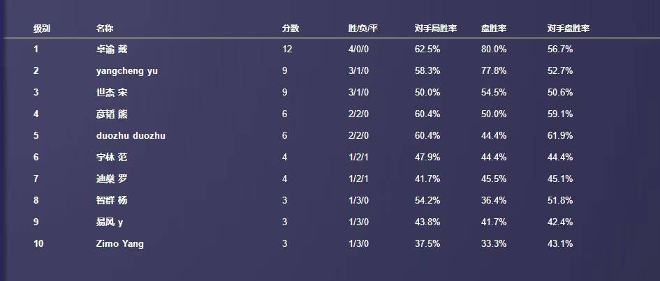 以上是10位参赛牌手的比赛积分.