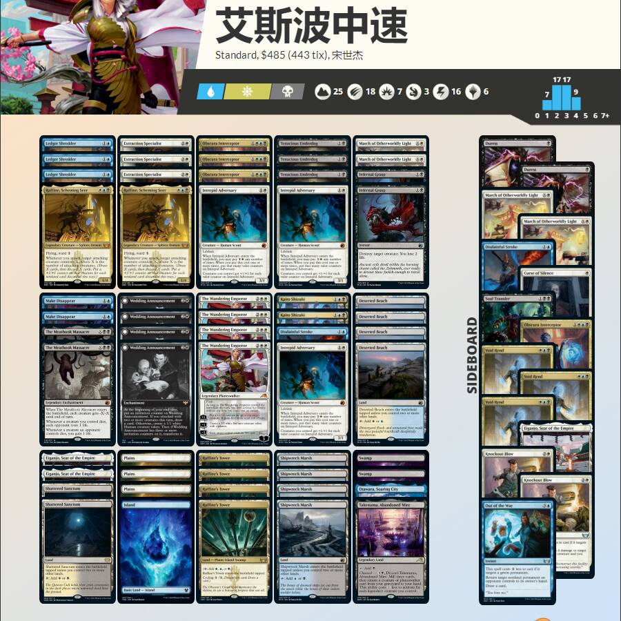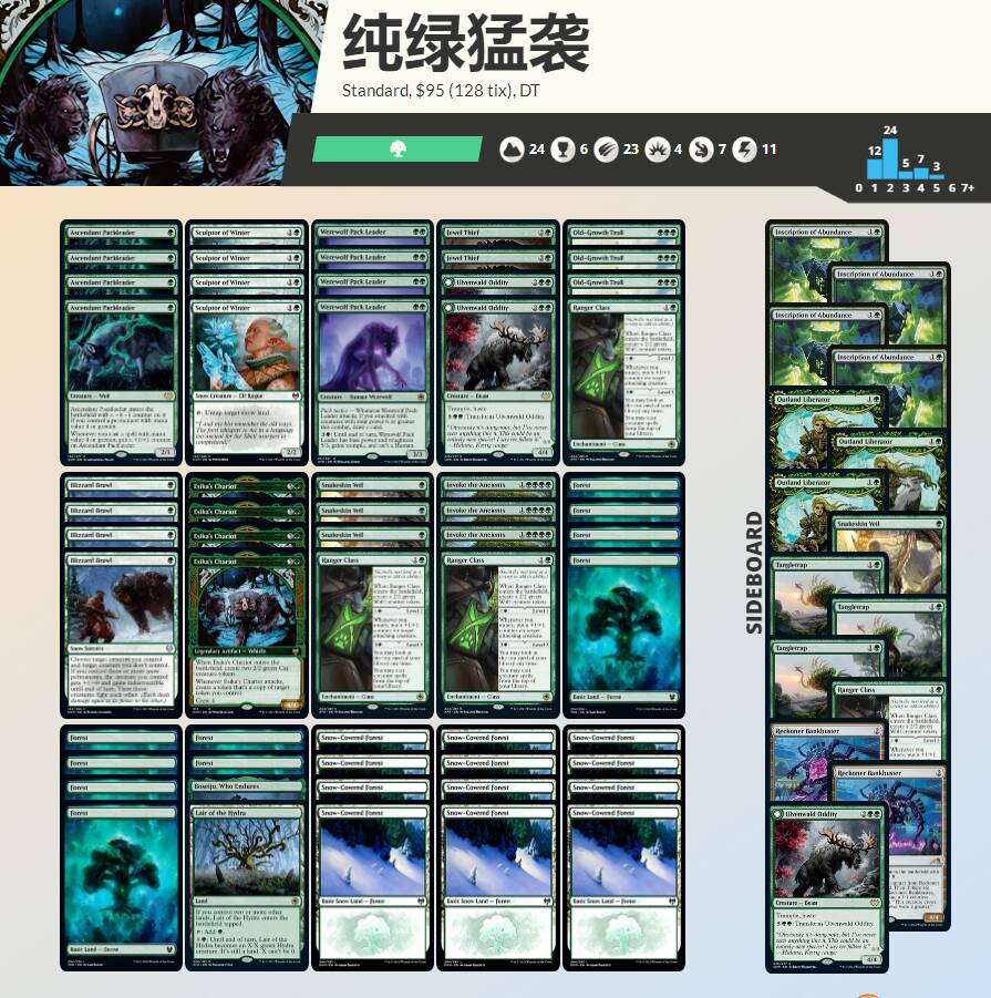 地没有全用雪境地的唯一原因是没收齐,翻箱倒柜从摩登和老edh里东拼西凑就找到12雪境树林,秉承摆烂原则剩下用普通树林凑合着就上了。然后比赛途中经常就是暴雪争斗触发不了不灭还有凛冬塑师没有雪地重置导致高费曲线晚一回合等各种抽象事件频繁发生,还好对手也经常卡地爆地,再加上蛇皮帘幕上手比较及时让我有幸卷了比赛。