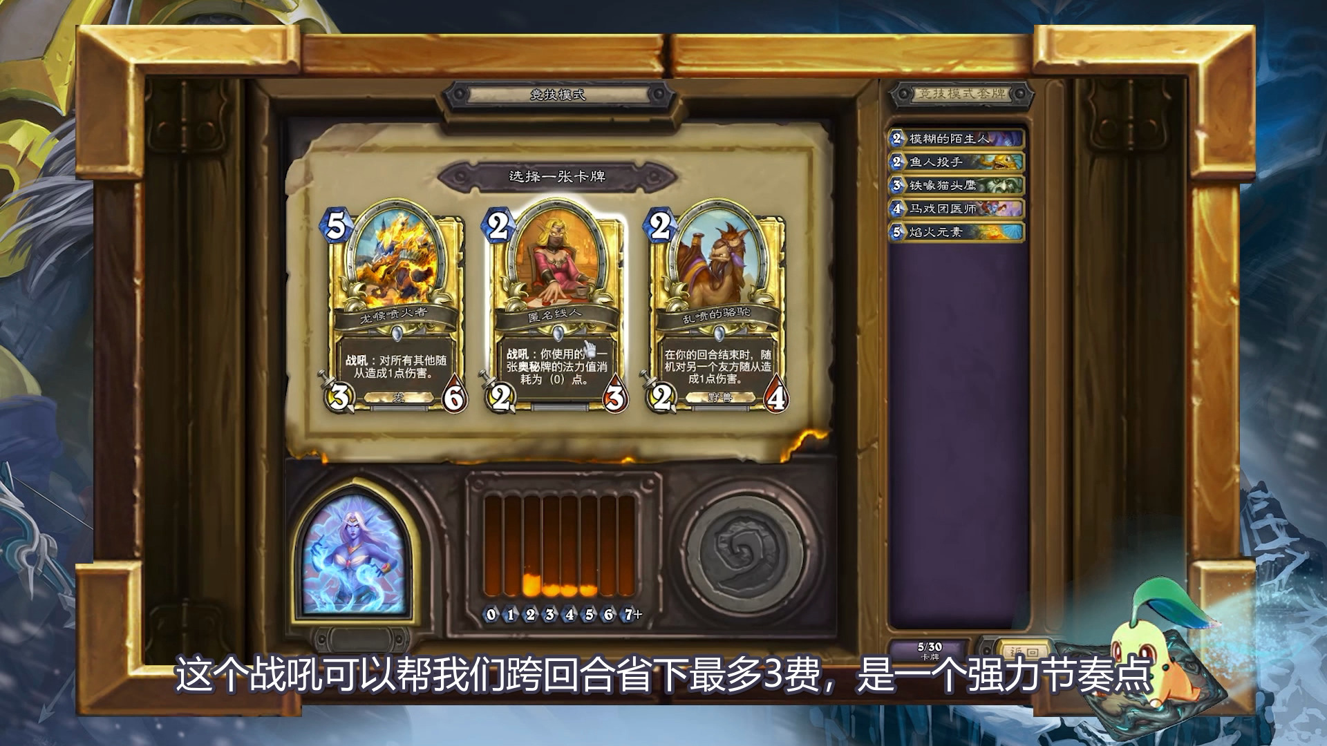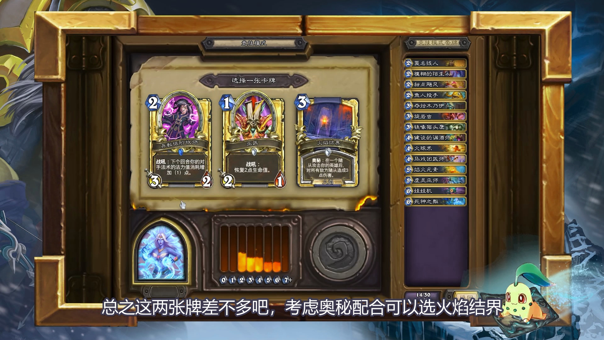 火焰结界这张牌我个人不是很喜欢,主要是他对场面没帮助,自己先手对面是不会打脸的,挂了等于白挂。总之这两张牌差不多吧,考虑奥秘配合可以选火焰结界,但我还是拿了个能打架的怪,异教dj牧师2费裸出还可以卡对面硬币。