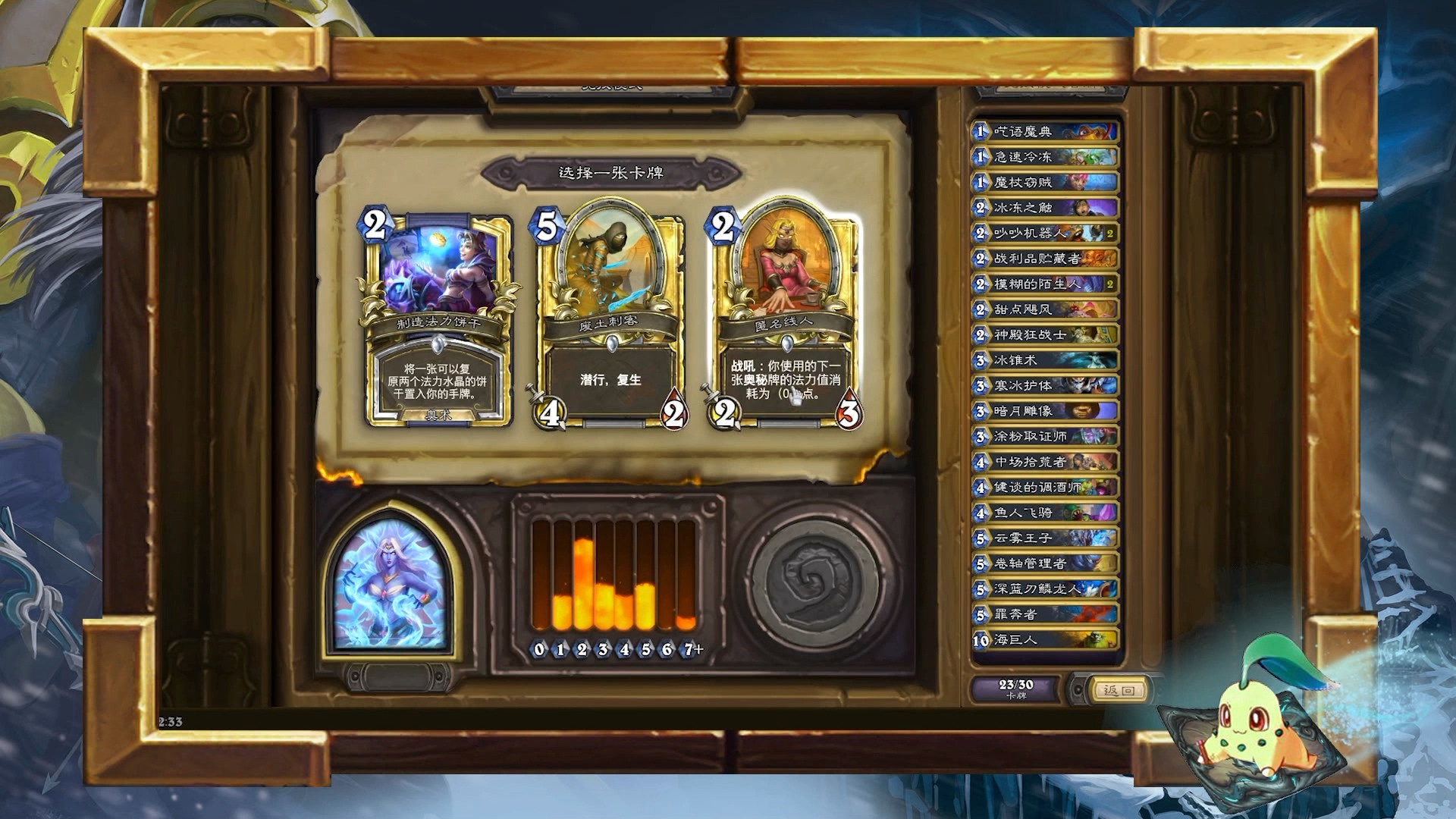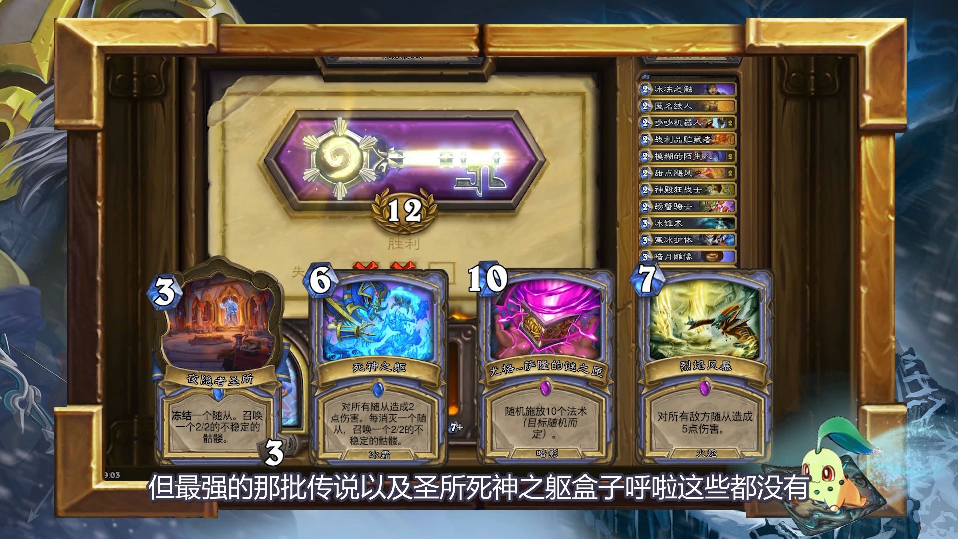 那么这套就选完了,虽然也有不少好卡,但最强的那批传说以及圣所死神之躯盒子呼啦这些都没有。前几抓也有不少残疾人,最精髓的还是把冰甲、冰锥、急速冷冻、云雾王子这些垃圾卡全都利用起来,构筑成了一套节奏强力的打脸12胜套牌!