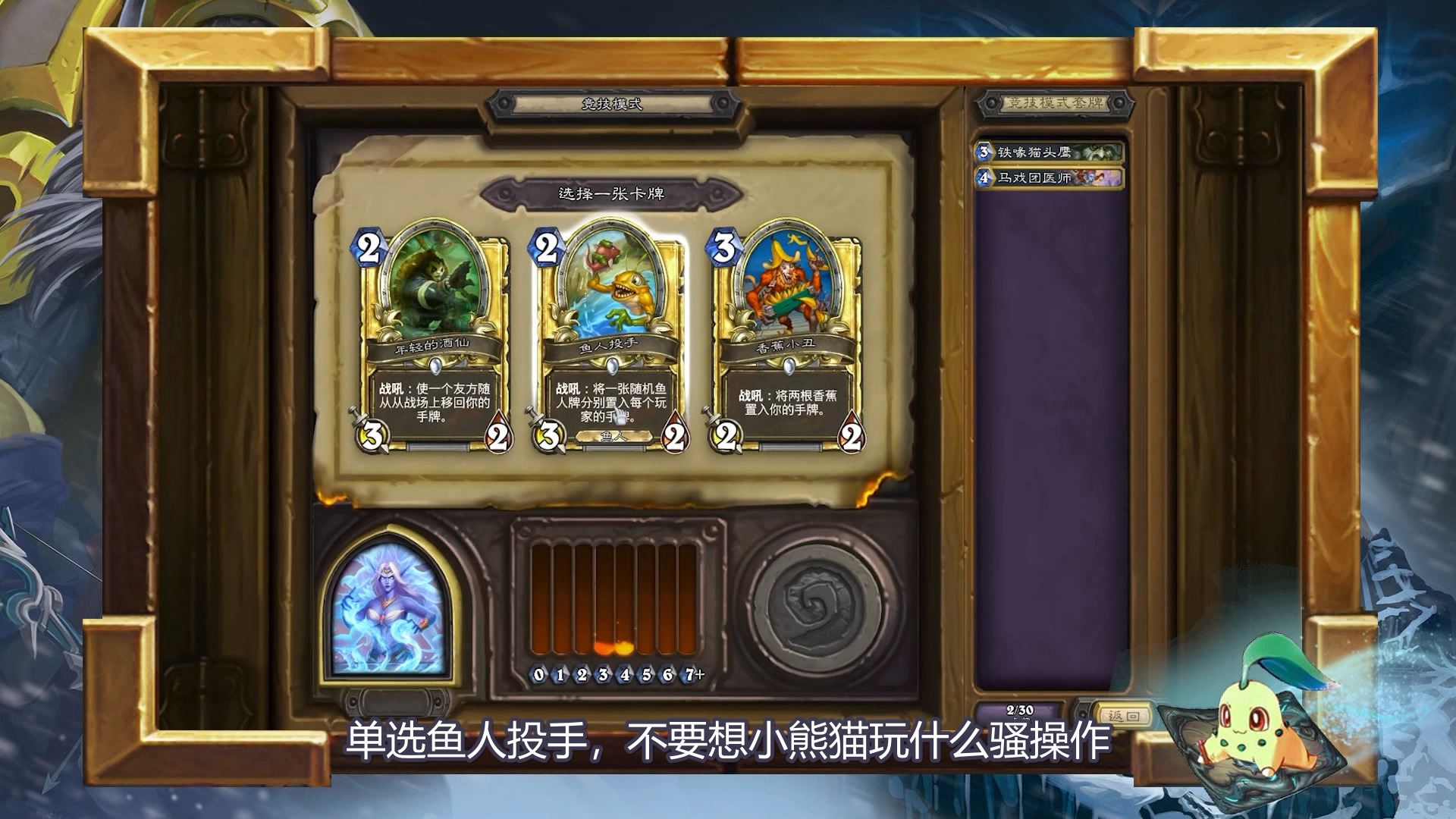 单选鱼人投手,不要想小熊猫玩什么骚操作,快攻版本就是要曲线拉满,不要卡手。鱼人投手给自己续航,帮助打满费用,负面效果可以忽略不计,不用怕给对面过牌,快攻卡组只能打死对面就行了~