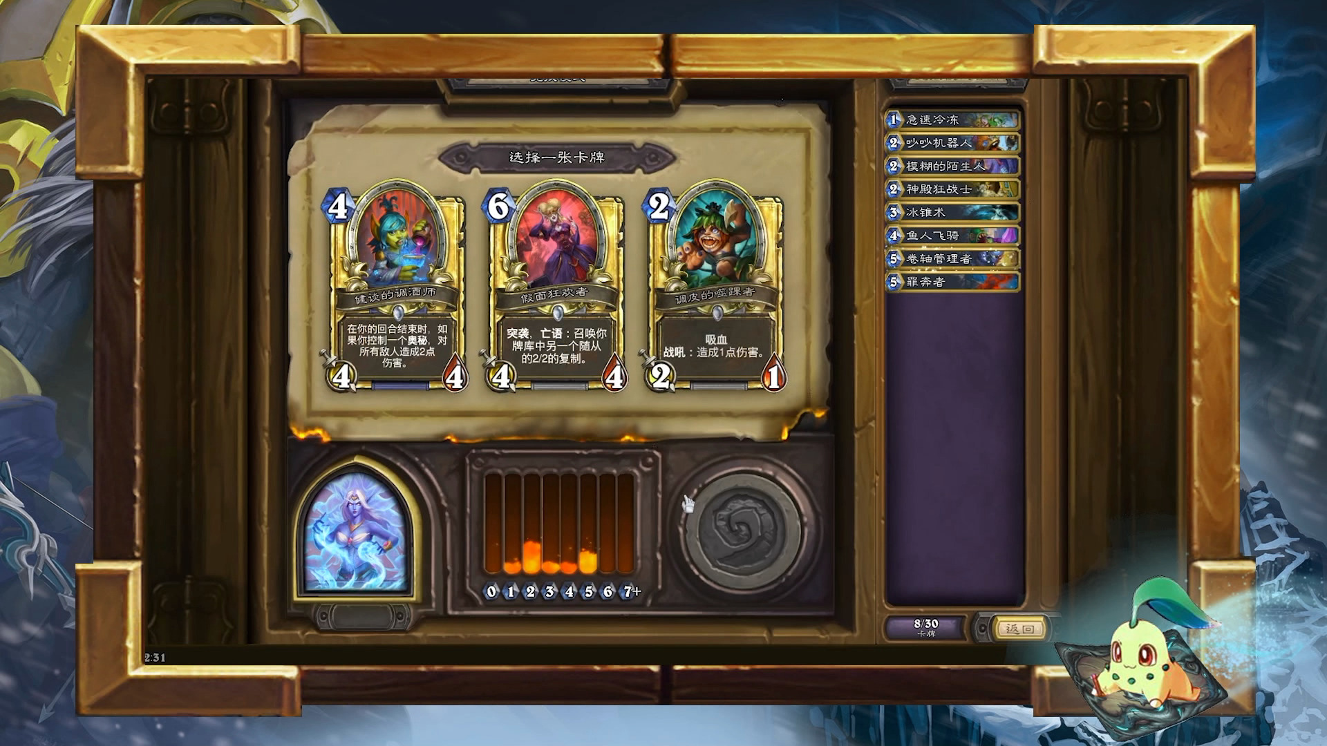 最后一抓了,有朋友要说,这套这么薄又缺直伤,这不得选个面具?但是这个鱼人吸血鬼对于快攻而言更是神卡,我们前期频率很容易铺开,中期0费34是一个强力节奏点。这张牌我看很多人不喜欢,但绝对是强于蛛魔先知和通道的存在,在快攻内战里下个吸血也挺恶心对面的,所以直接拿下!