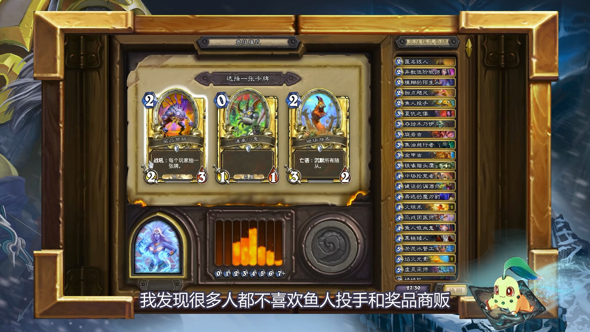 这套牌曲线还是很低,可以选个奖品商贩。因为我们直伤多,可以找直伤糊对面脸。我发现很多人都不喜欢鱼人投手和奖品商贩,但还是那句话,快攻给对面过牌无所谓,节奏拉满打死对面就行了!