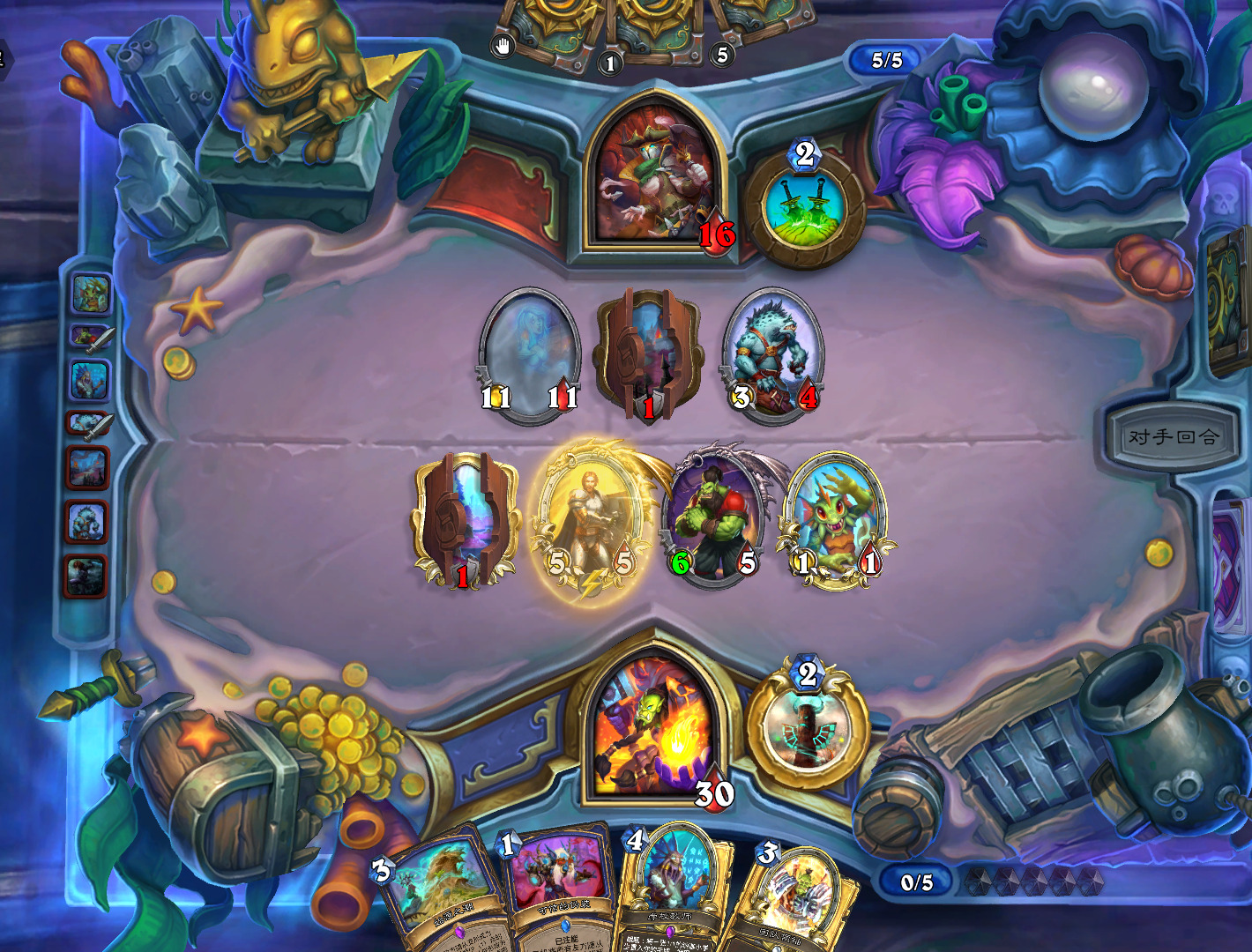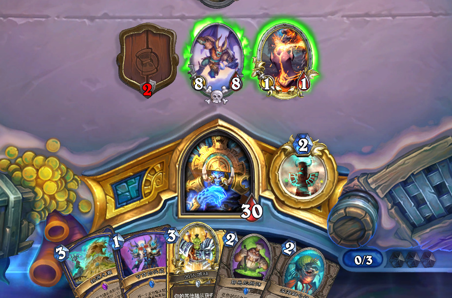 一种情形,奇迹贼用完了所有手牌,造了个超级大怪,但是我们丝血未扣,场上还有对手解不完的随从,就算让它踢一脚也没事啦,贼的血线要比我们更宝贵,当贼血量够低时,操作会大量变形,我们只要打脸!