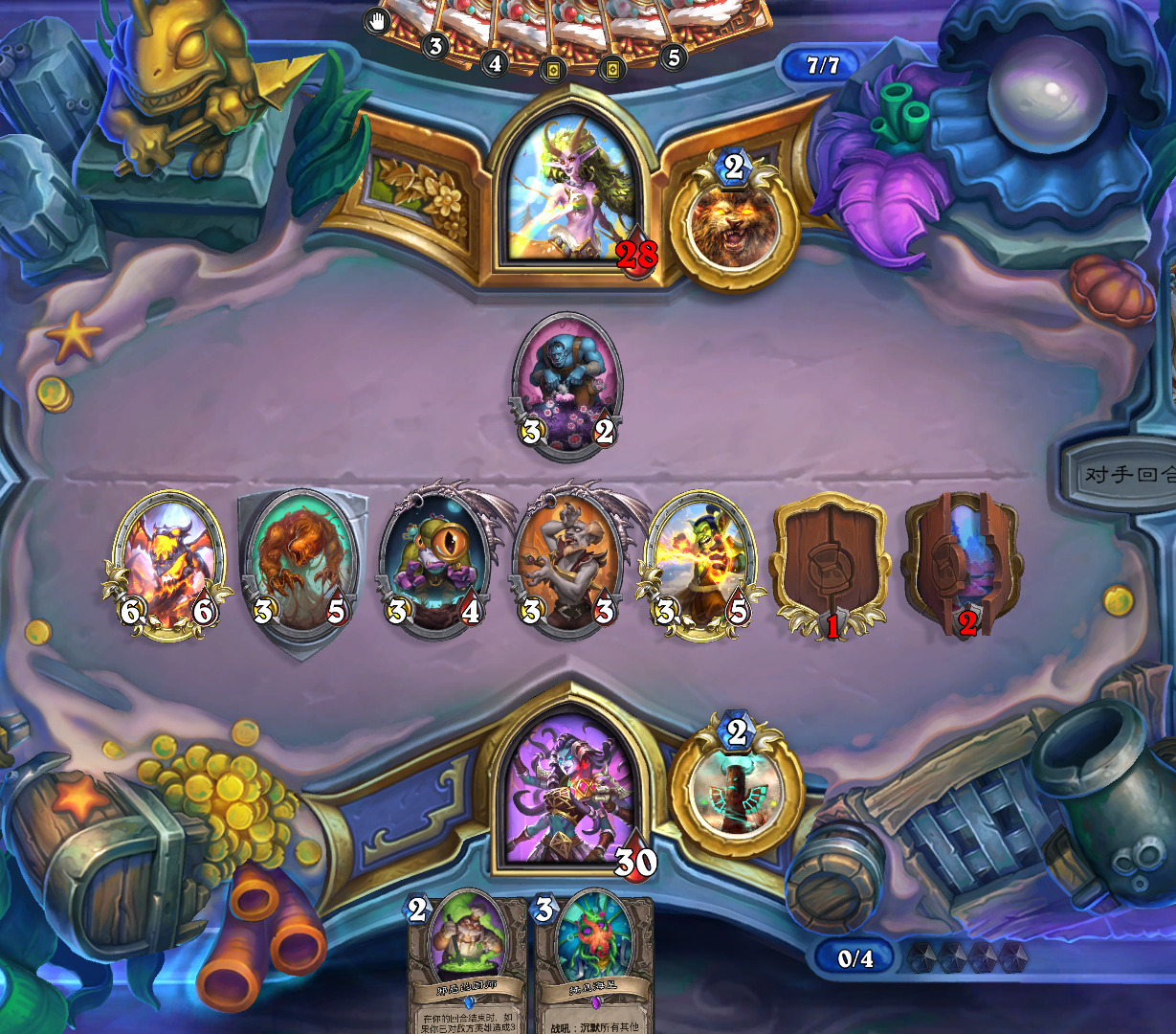 第一回合地标,第二回合要图腾就进化,不要觉得给图腾进化浪费了喔!这样才能站住场,说不定还有不可思议的事情发生,如上图这把,车队就偷了敌方的伺机待发让我提前一个回合释放了蛮爪洞穴,最后赢得了对局,这就是进化萨的羁绊啊!