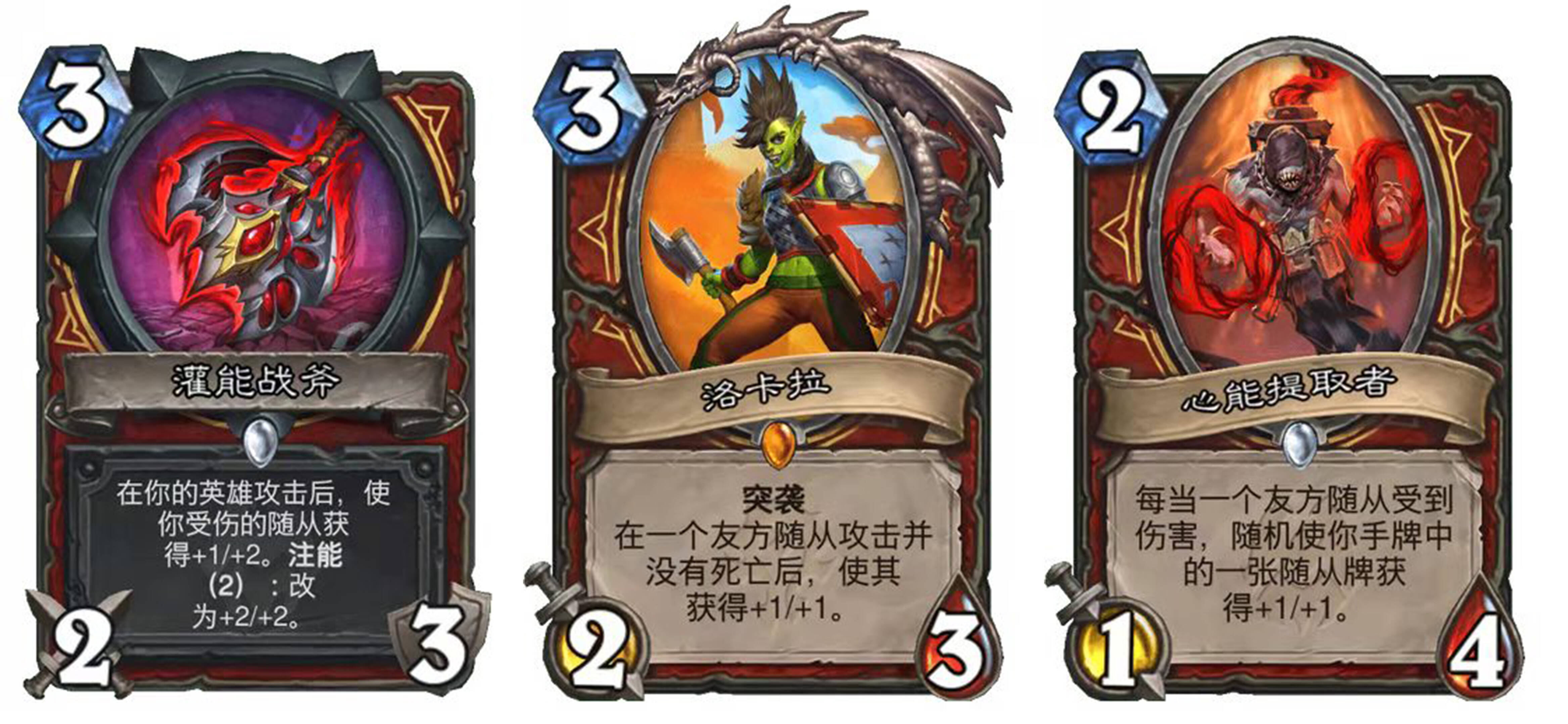 ·灌能战斧:激怒战双核心之二,也是新版本最为重要的补强卡,完美解决激怒随从普遍都是1攻的羸弱场面。注能效果不是关键,前期抽到可以直接挂,配合艇长与受伤随从强化场面。